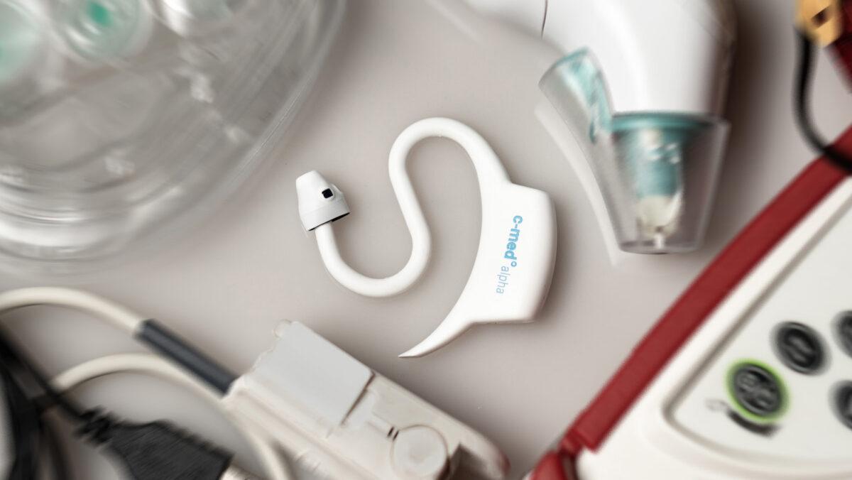 Der c-med° alpha ist ein kleiner, 6,5 g leichter im Ohr tragbarer Sensor, der kontinuierlich Körpertemperatur, Sauerstoffsättigung, Perfusion und Pulsfrequenz misst. In der cosinuss° Health App werden die erfassten Vitalparameter und Qualitätsindikatoren übersichtlich dargestellt. Der Gehörgang bietet dank seiner Lage, stetigen Durchblutung und zentraler Positionierung entscheidende Vorteile gegenüber anderen Messorten für optische Messungen. Zudem kann die Nähe zum Gehirn relevant für die Deutung der gemessenen Werte sein.