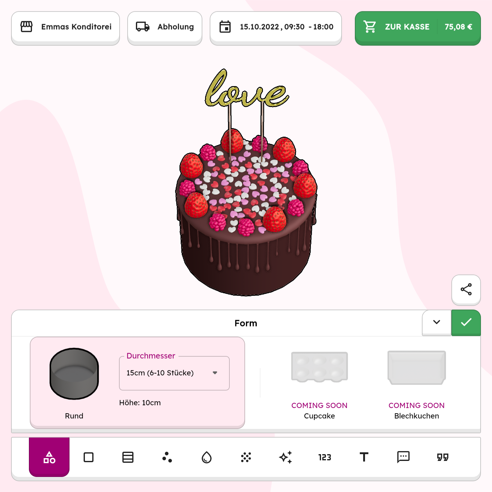 Configure your cake from more than 1,000,000 combinations. Choose the base, filling, look and much more for every occasion and every taste. Whether its party cakes, birthday cakes, engagement cakes or something special for the company celebration: There are no limits to your imagination.