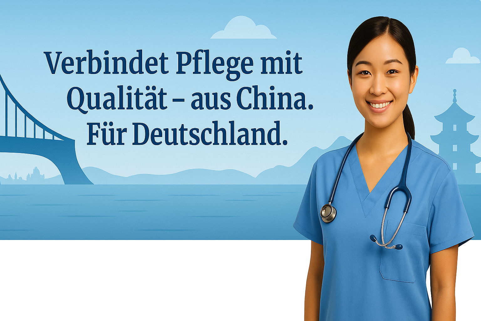 Unsere Mission: Wir bauen die Brücke. Zwischen China und Deutschland. Zwischen Pflegebedarf und Potenzial. Zwischen Systemüberlastung und Zukunft. Mit vier klaren Wegen – von der Hilfskraft bis zum Studium – und echter Begleitung, nicht nur Vermittlung.