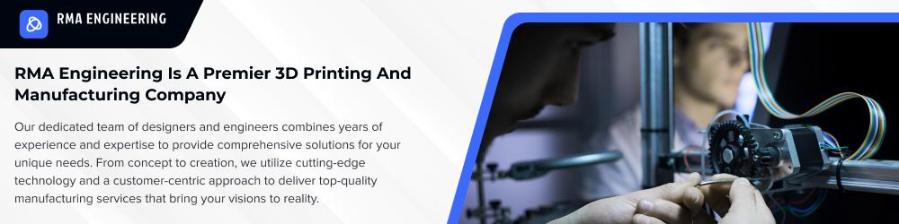 RMA Engineering is a premier 3D printing, prototyping and manufacturing company in New Jersey, offering quality printing services. Our comprehensive suite of services includes rapid prototyping, online 3D printing, design services, and 3D printing post-processing. RMA Engineering's commitment to innovation extends beyond solutions, with ongoing research into sustainable materials for 3D printing. Additionally, our dedication to client satisfaction remains paramount, evident through our tailored solutions and responsive support team.